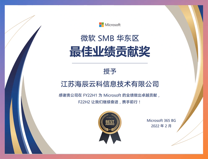 熱烈祝賀江蘇海辰在2021年與微軟的合作中,獲得了Microsoft FY22 H1 SMB東區(qū) 最···